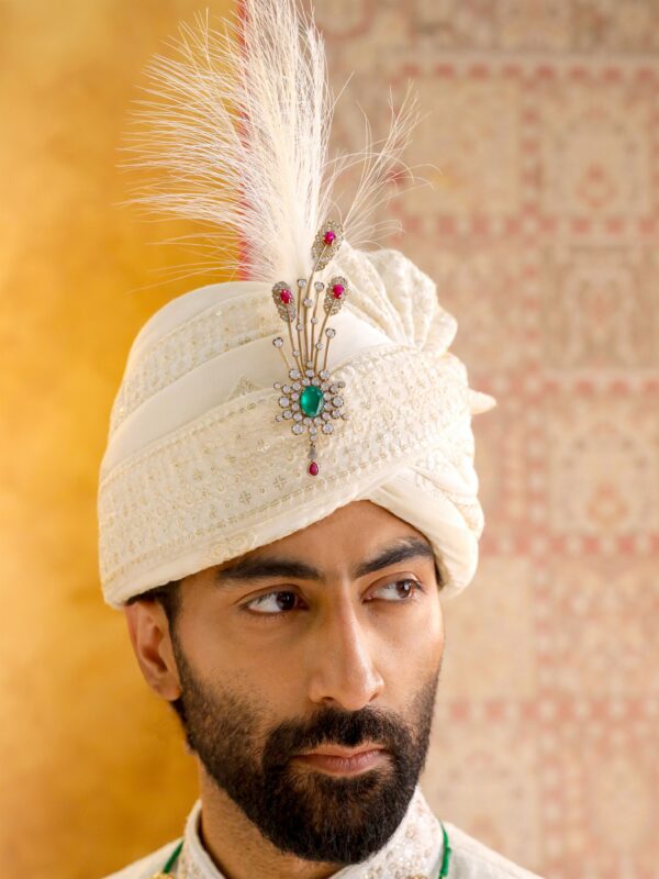 The Rajputana Ruby Kalangi is a statement of royal splendor and timeless tradition. Crafted in antique gold tones, the centerpiece is adorned with radiant ruby red stones framed in intricate filigree, highlighted with white kundan and dangling accents. The elegant plume of pristine white feathers adds a majestic flourish, symbolizing honor and pride. Perfect for grooms and ceremonial attire, this kalangi embodies the spirit of heritage with regal magnificence.
