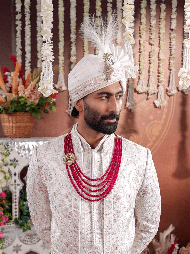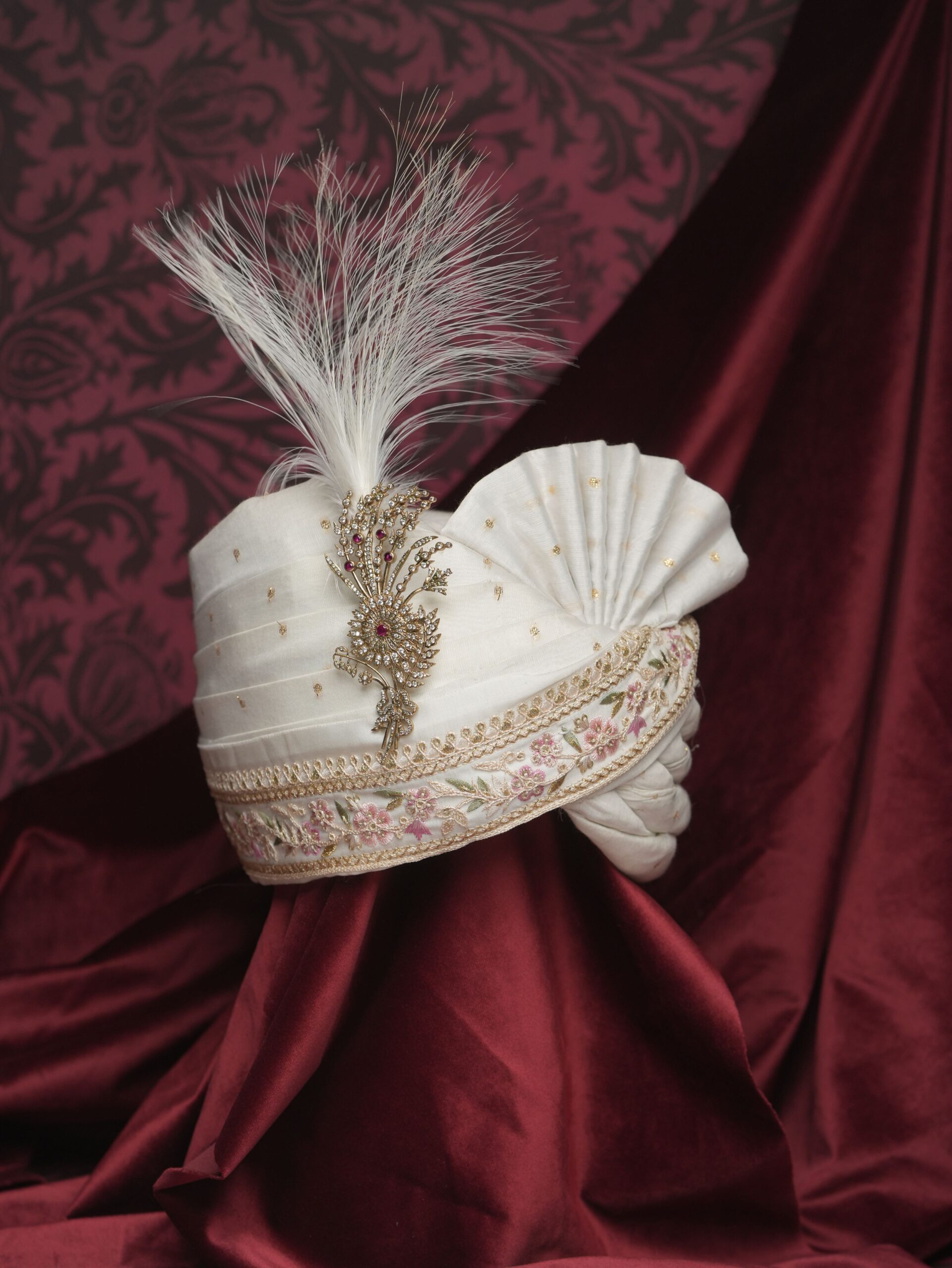 The Regal Bloom Kalangi is a masterpiece of royal elegance, designed for men who embrace tradition with grandeur. Crafted in antique gold finish, it blossoms with intricate floral motifs encrusted with sparkling white stones and radiant rubies. Adorned with pristine white feathers, this kalangi exudes a majestic aura, making it the perfect accessory for grooms and men of stature during weddings or ceremonial occasions.