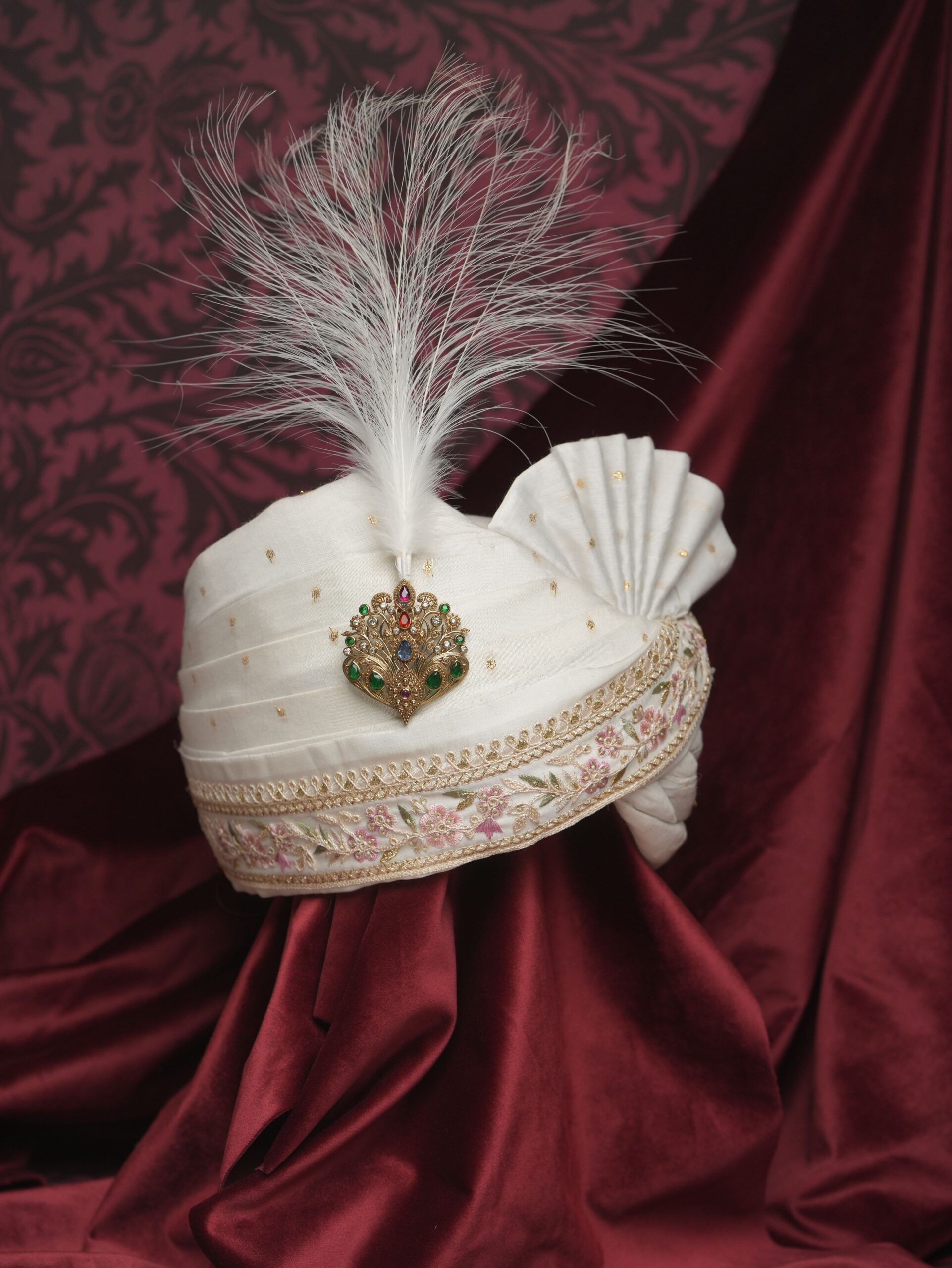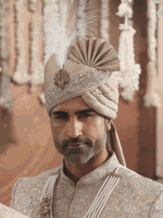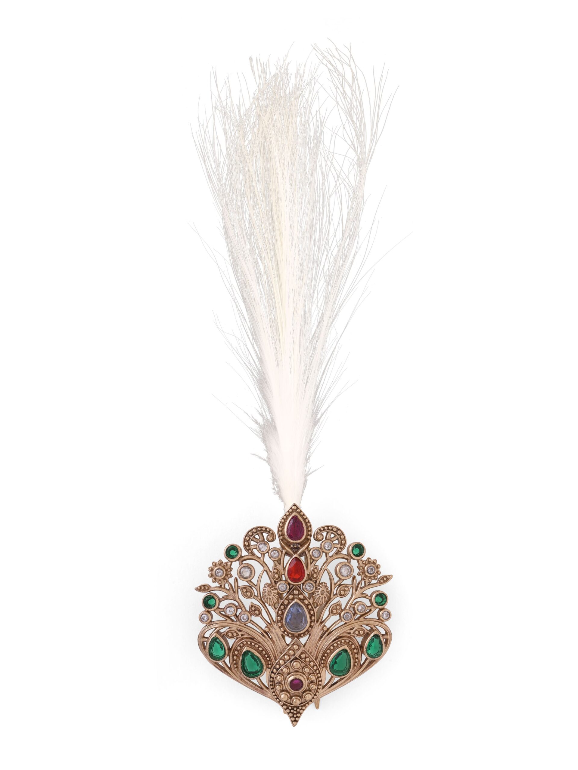 The Regal Navratna Kalangi is an opulent head adornment that embodies timeless royal tradition. Designed with an intricately detailed gold-toned base, it features a symphony of vibrant gemstones in red, green, and white, beautifully arranged in floral and paisley motifs. The centerpiece plume of pristine white feathers adds a majestic flourish, making this kalangi an exquisite choice for grooms and men who embrace grandeur in ceremonial attire.