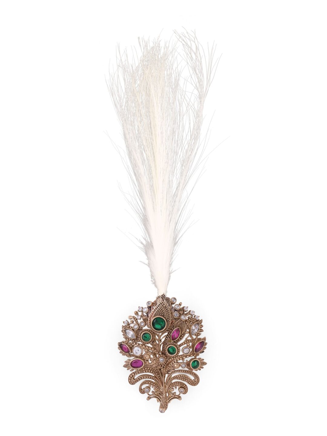 This set features a detailed peacock motif, a symbol of pride and grace in Indian tradition.The mala is crafted with layers of elegant white pearls, while the kalangi is finished in antique gold with colorful stones.The design blends richness with heritage charm.Ideal for weddings, festive occasions, and royal celebrations.