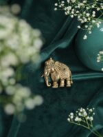 Symbolizing power, wisdom, and grandeur, The Regal Elephant Brooch is a majestic accessory crafted in antique gold finish with intricate detailing. Embellished with striking green stones, it reflects the royal tradition of adorned elephants in Indian heritage. A perfect statement piece for sherwanis, bandhgalas, or formal suits, it elevates a man?s ensemble with a touch of timeless regality.