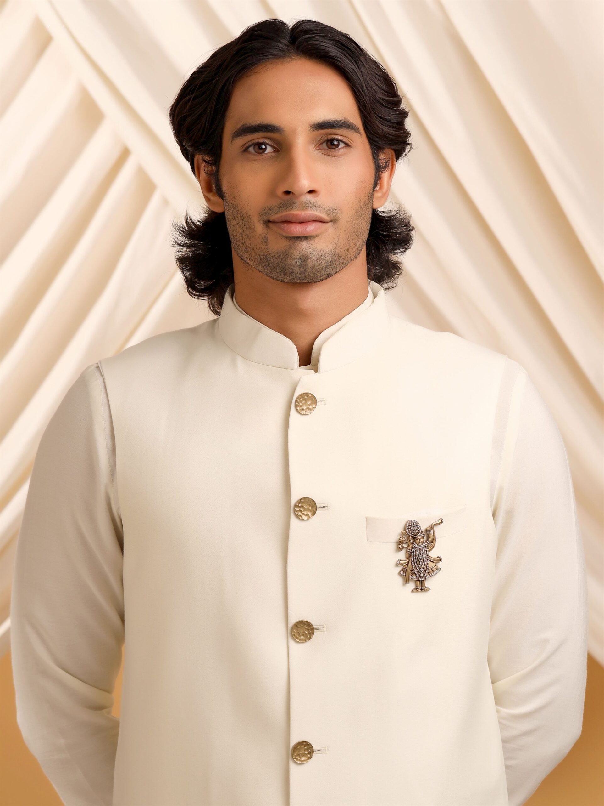 This brooch captures the essence of Shreenathji's divine form, adorned with detailed embellishments and delicate craftsmanship. The figure is intricately sculpted with fine detailing, highlighting his regal posture and symbolic attributes like the lotus and ornate attire. The surrounding frame, decorated with sparkling stones and a floral motif, enhances the deity?s central presence, making it a standout accessory that evokes both elegance and devotion.