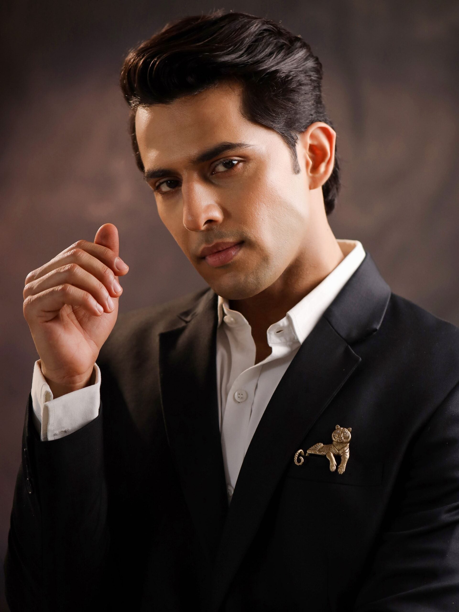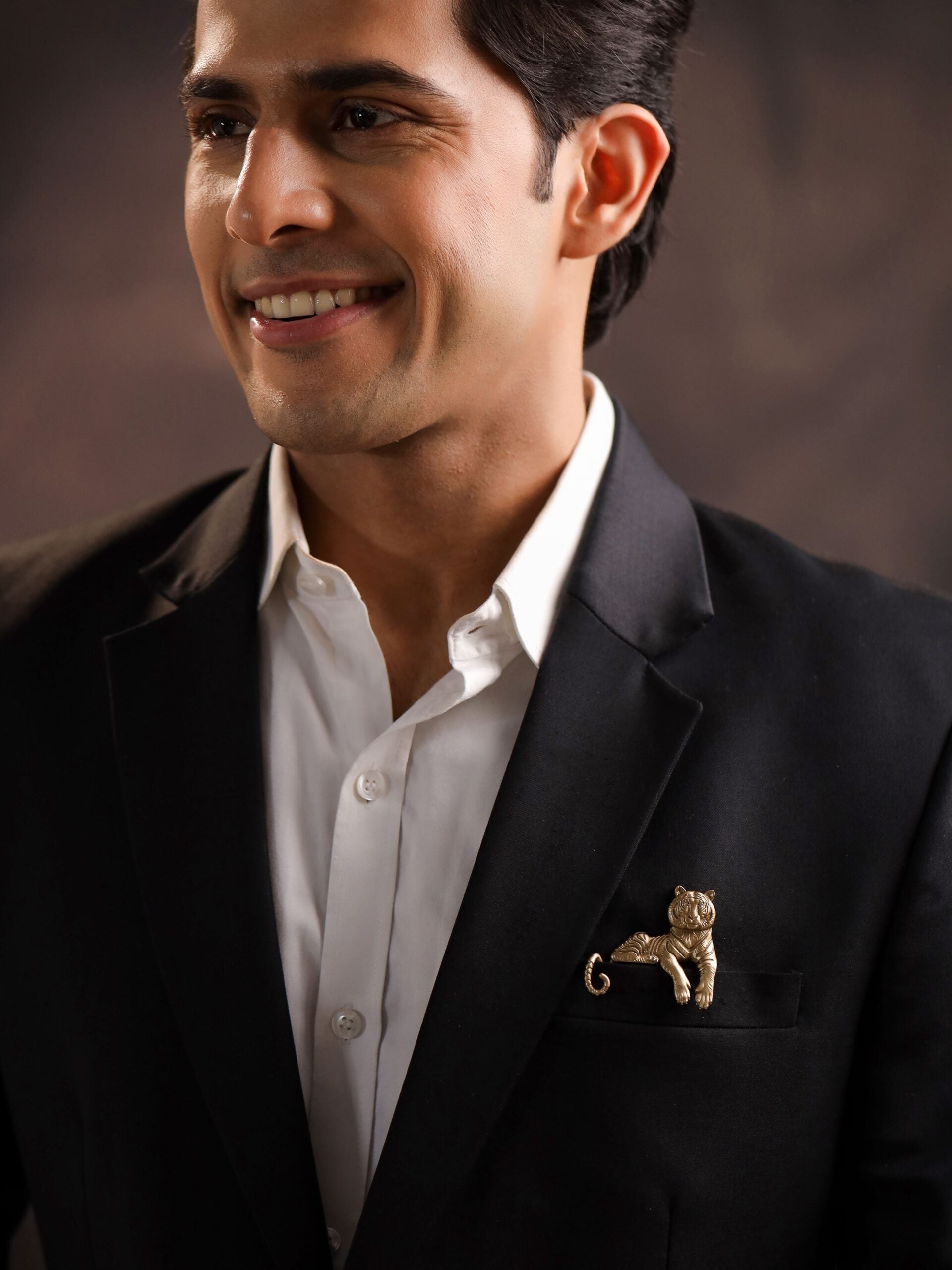 This brooch masterfully captures the regal poise of a tiger in repose, exuding both tranquility and an unspoken command of its surroundings. The detailed stripes and sculpted form give it an aura of lifelike elegance, while its placement in the pocket makes it seem as though the tiger itself is watching over its domain. The Enigmatic Stripes Brooch is a statement of untamed power, designed for the modern man who wears confidence as naturally as the tiger wears its stripes.
