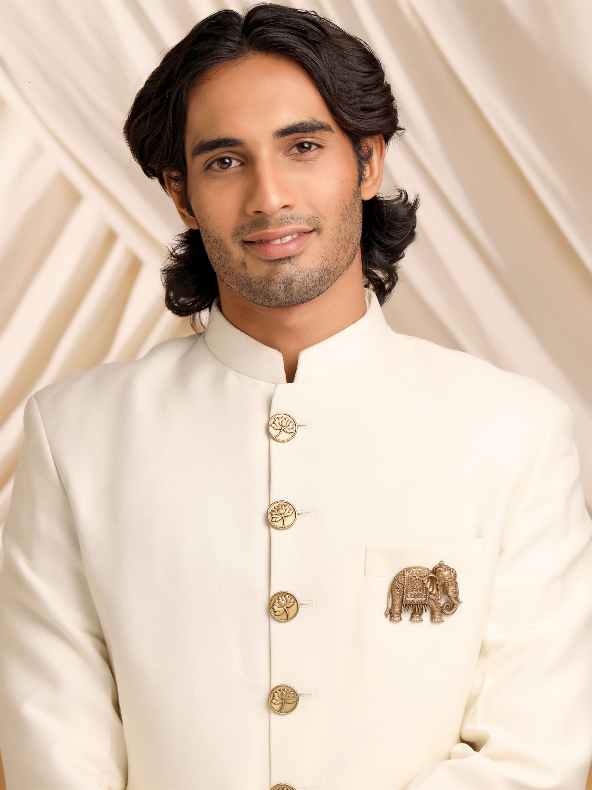 The brooch highlights meticulous detailing, especially in the elephant's ornate blanket and headgear, inspired by traditional Indian designs. The patterns feature floral and geometric motifs, often found in ancient Indian textiles and architecture. The hanging bell elements further enhance the design, reminiscent of the bells that would jingle with the steps of the elephants in historic processions. The intricate carvings, down to the anklets and headdress, reflect a deep appreciation for artisanal craftsmanship, bringing a sense of timeless elegance to the piece.