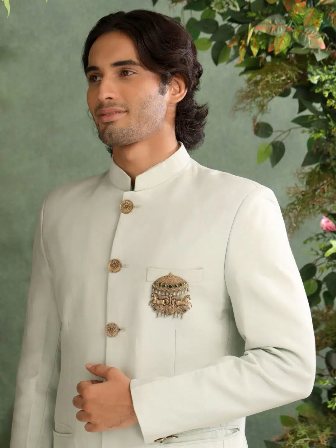 The umbrella, adorned with green gemstones, represents protection and status, frequently seen in royal or ceremonial events across cultures. The detailed parasol and tassels add a sense of ornamental richness, while the intricate craftsmanship in the horses and surrounding patterns further enhances its visual appeal. The green stones bring a touch of opulence, making this brooch a statement piece that captures historical pageantry with timeless elegance.