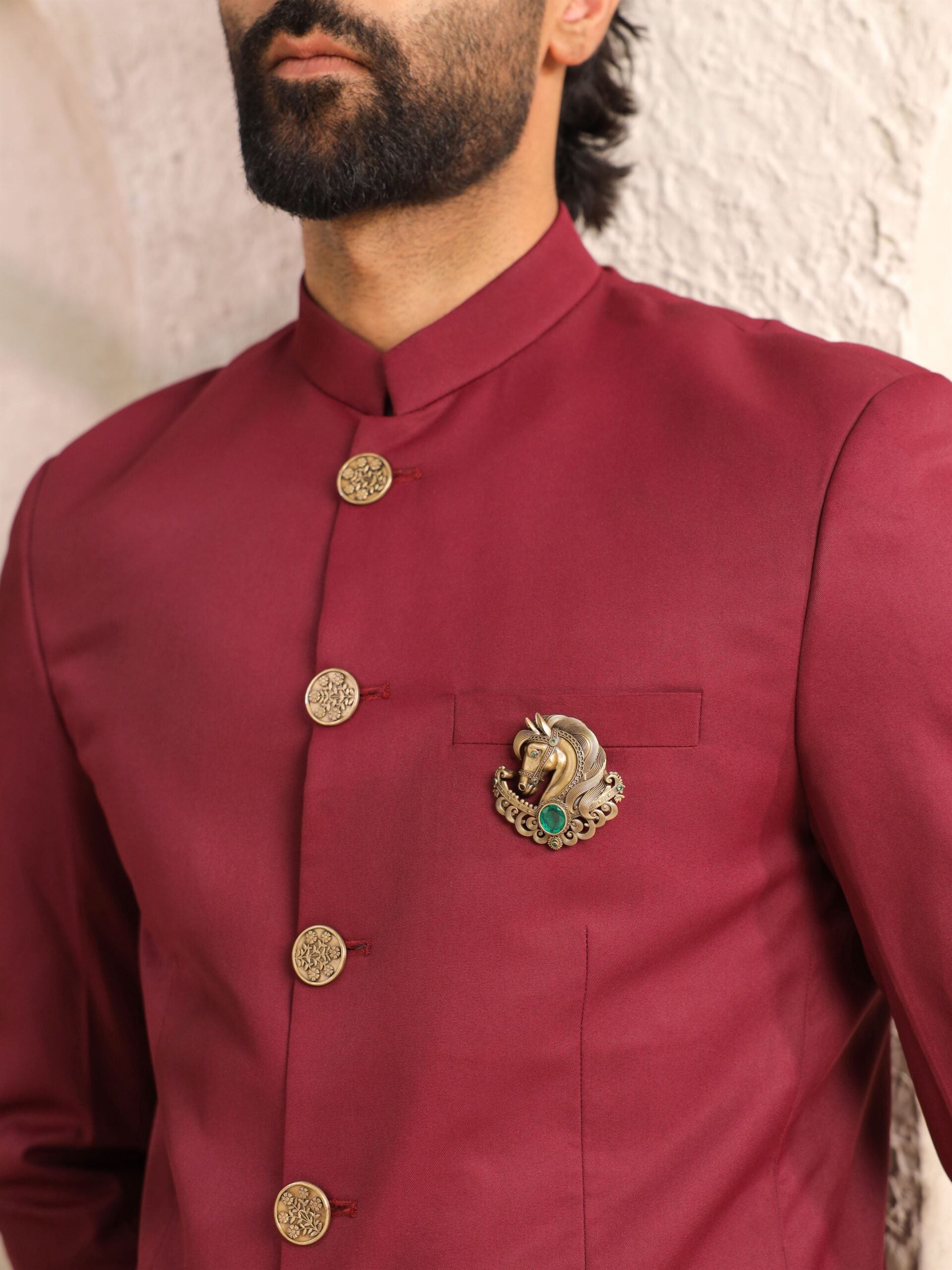 The Imperial Horse Emerald Brooch reflects valor, elegance, and timeless regality. Expertly cast in antique-finished brass, it features a finely sculpted horse head adorned with detailed reins. A striking emerald-green centerpiece, framed by ornate scrollwork and accented with smaller green stones, adds depth and grandeur to the design. Perfect for grooms and men of distinction, this brooch is a statement of strength and refined taste, enhancing ceremonial and festive attire with royal charm. Product Dimension : 5.5X5.5 CM Weight : 36.65 Color : Antique Gold Pack Details : 1 Brooch