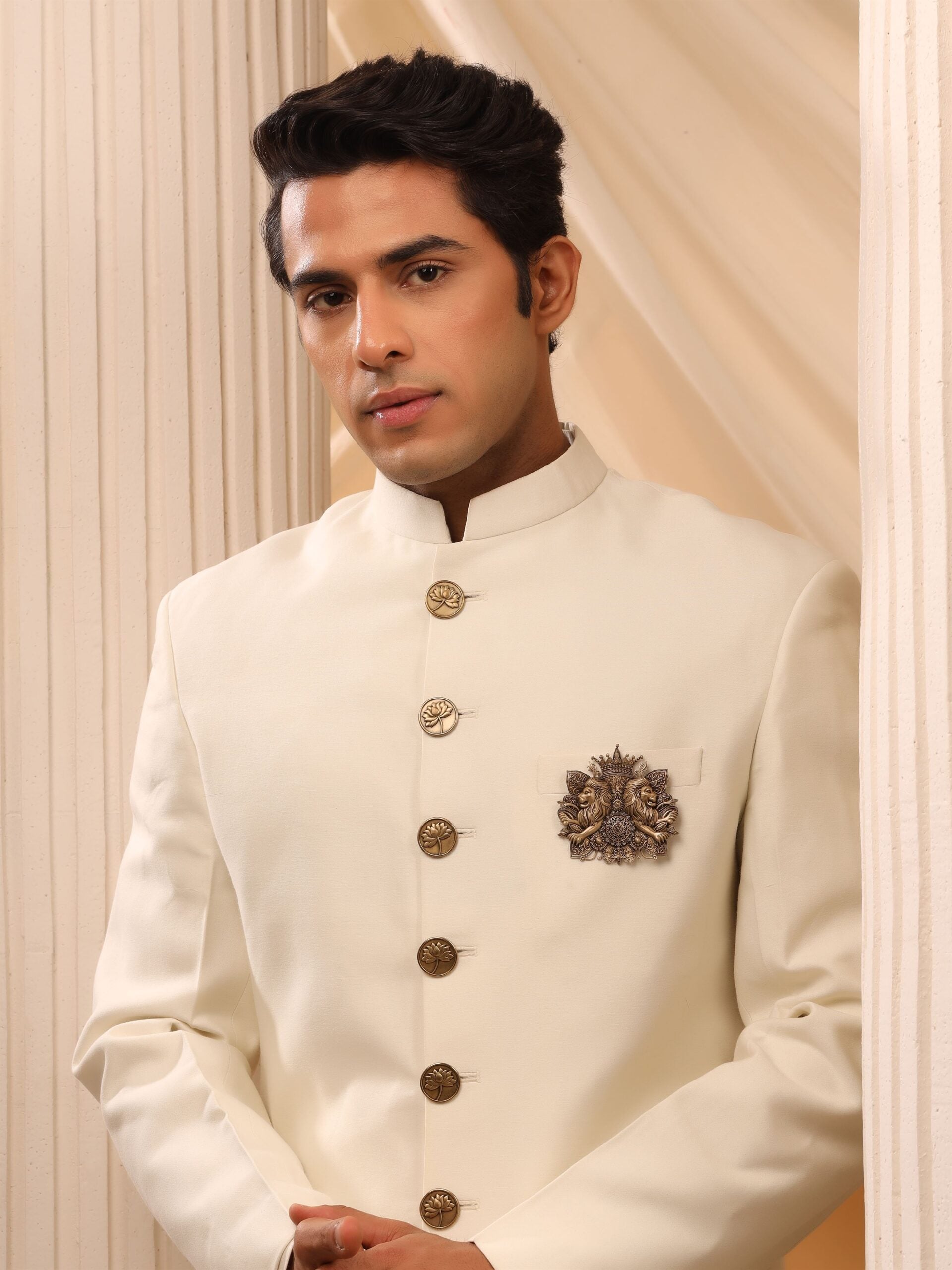 The emblem features a pair of lions, their manes flowing and eyes reflecting wisdom. They are surrounded by beautiful, symmetrical patterns that resemble leaves or floral designs. A crown with multiple points and spheres on top adorns the upper middle part of the emblem, indicating a royal theme.