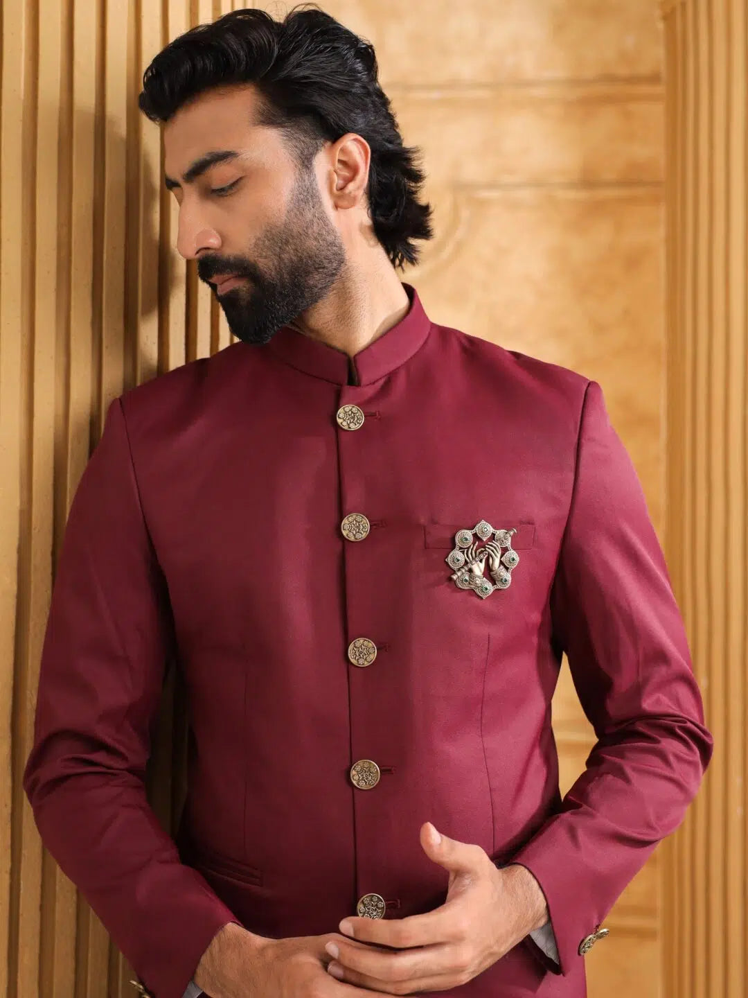 The Krishna?s Melody Brooch is a tribute to the eternal charm of Lord Krishna and his divine flute. Crafted in fine brass with an antique gold finish, it beautifully depicts Krishna?s graceful hands adorned with jewels, holding the bansuri ? the symbol of love, devotion, and music.\n\nAccented with emerald-green and ruby-red stones, this brooch echoes the splendor of Vrindavan?s timeless melodies. Lightweight and elegant, it makes a perfect adornment for a bandhgala, sherwani, or festive jacket.\n\nWear this piece of divine artistry as a reminder of Krishna?s soulful raasleela and the eternal harmony between tradition and elegance.\nProduct Dimension : 6.7X6.7 CM\nWeight : 43\nColor : Antique Gold\nPack Details : 1 Brooch