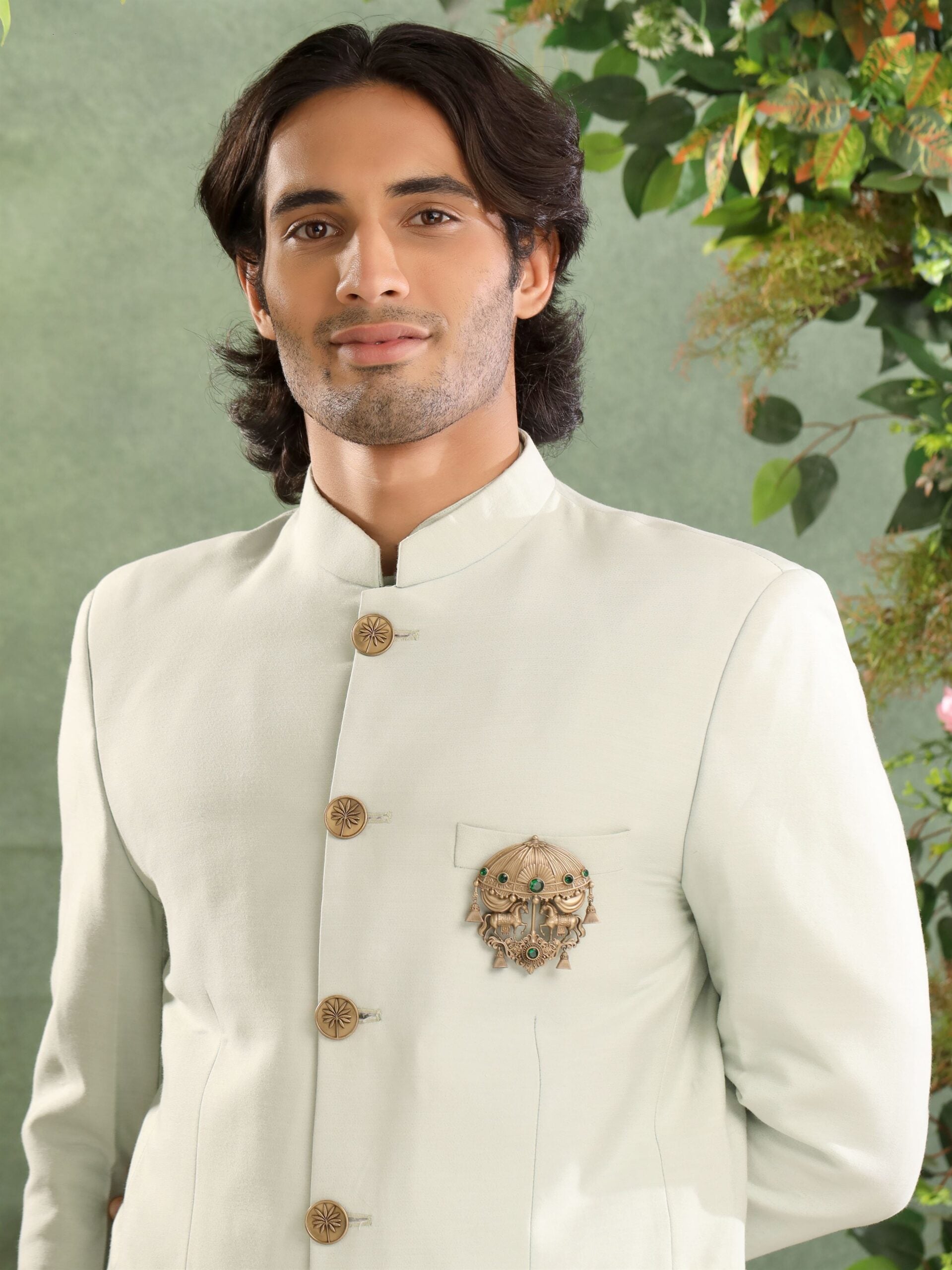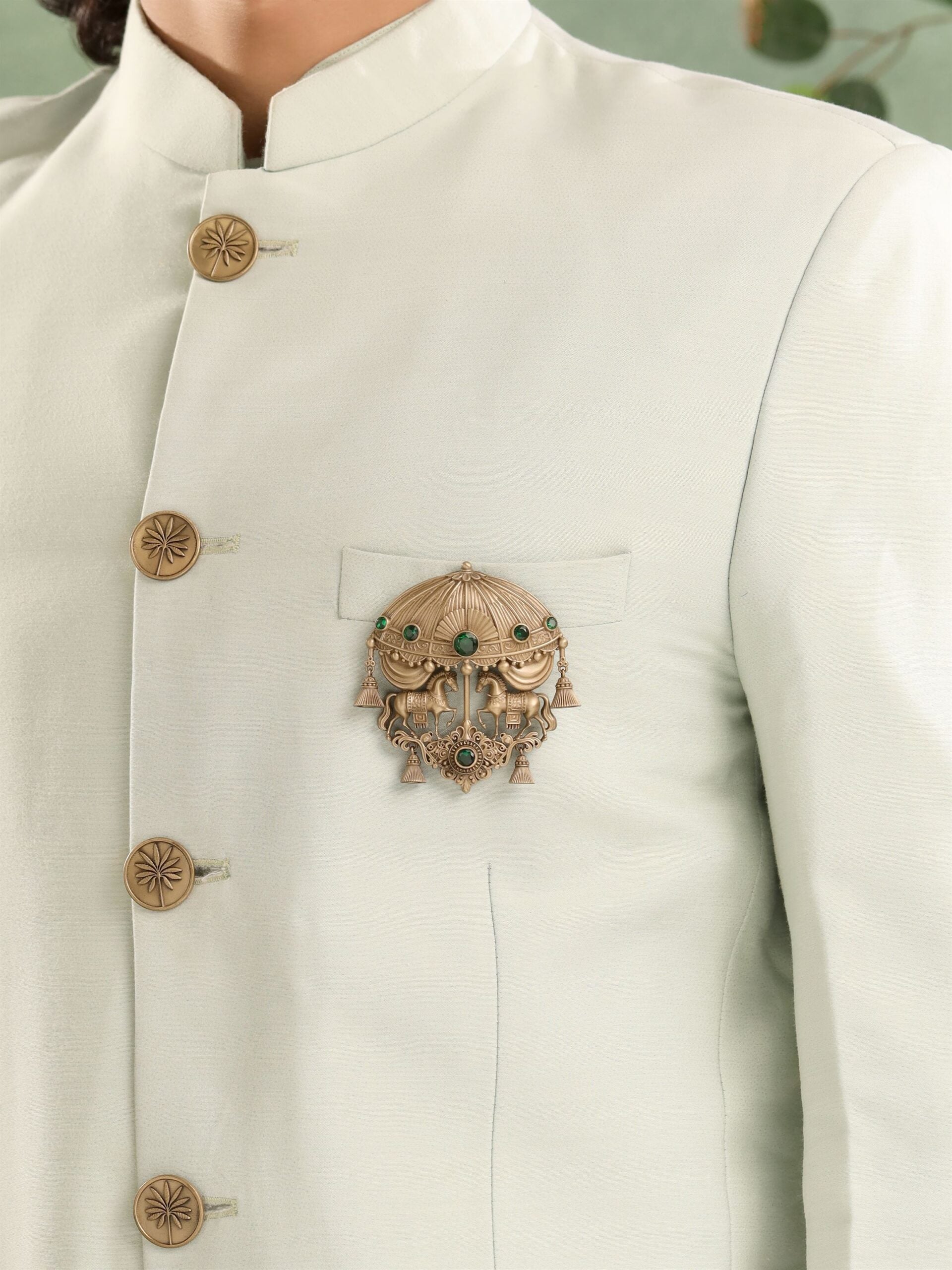 The parasol-like canopy, intricately detailed with rich textures and green gemstones, evokes imagery of royal carriages or ceremonial chariots. The draped design and tassels suggest protection, shelter, and high status, traditionally associated with leadership and special occasions. The green stones further add a touch of vibrancy and luxury, enhancing the opulent nature of the design. The overall composition fuses historical elements of regality with a finely crafted aesthetic, making it a timeless statement piece