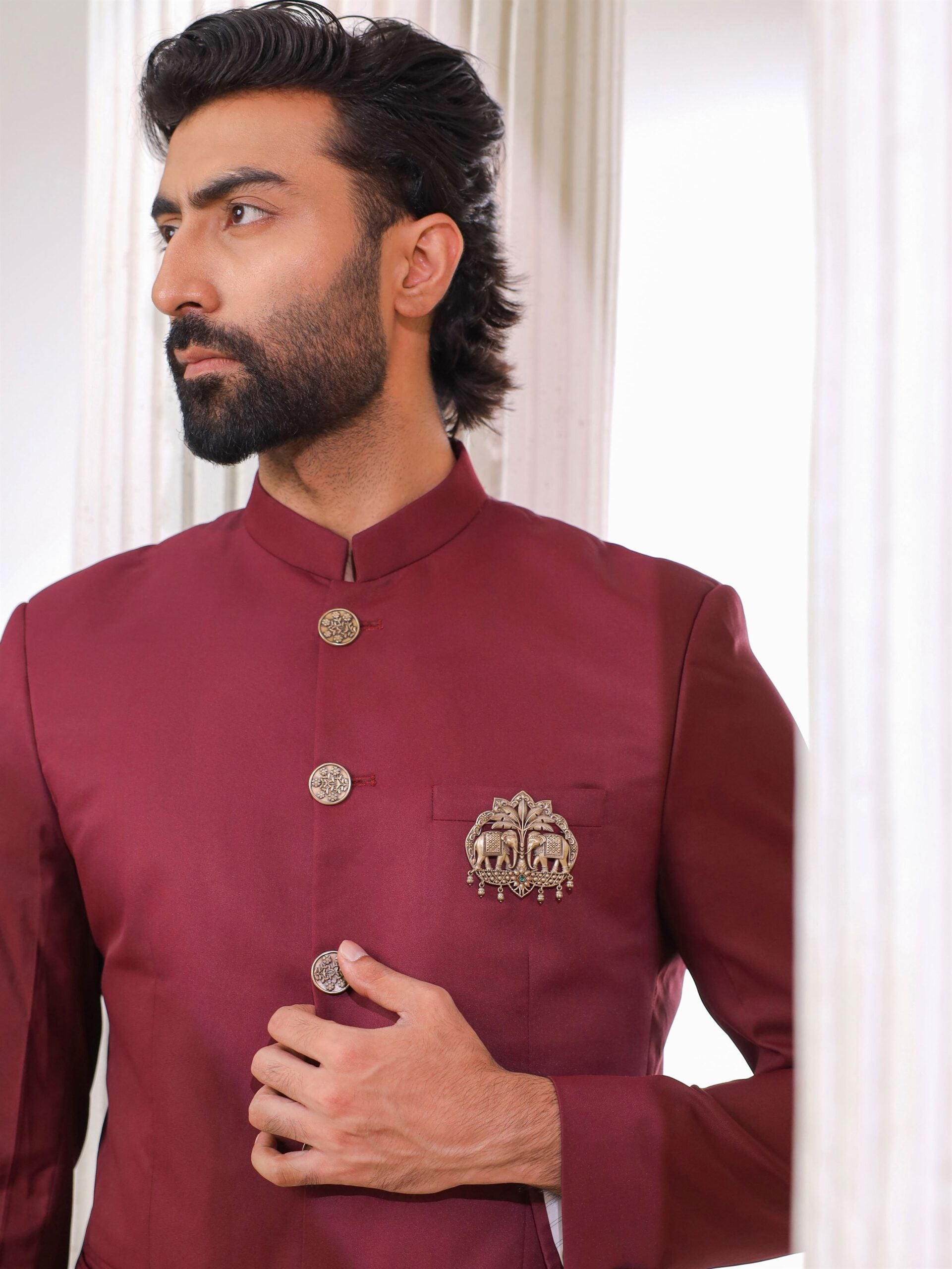 The Royal Elephant Duo Brooch embodies prosperity, wisdom, and heritage splendor. Crafted in antique-finished brass, it features two richly adorned elephants standing beneath a stylized palm tree, framed with intricate detailing. A floral motif set with an emerald-green stone at the base adds a touch of vibrance, while the hanging droplet elements enhance its grandeur. A perfect accessory for grooms and men of refined taste, this brooch brings a majestic presence to ceremonial and festive attire. Product Dimension : 6.5X4.3 CM Weight : 14.5 Color : Antique Gold Pack Details : 1 Brooch