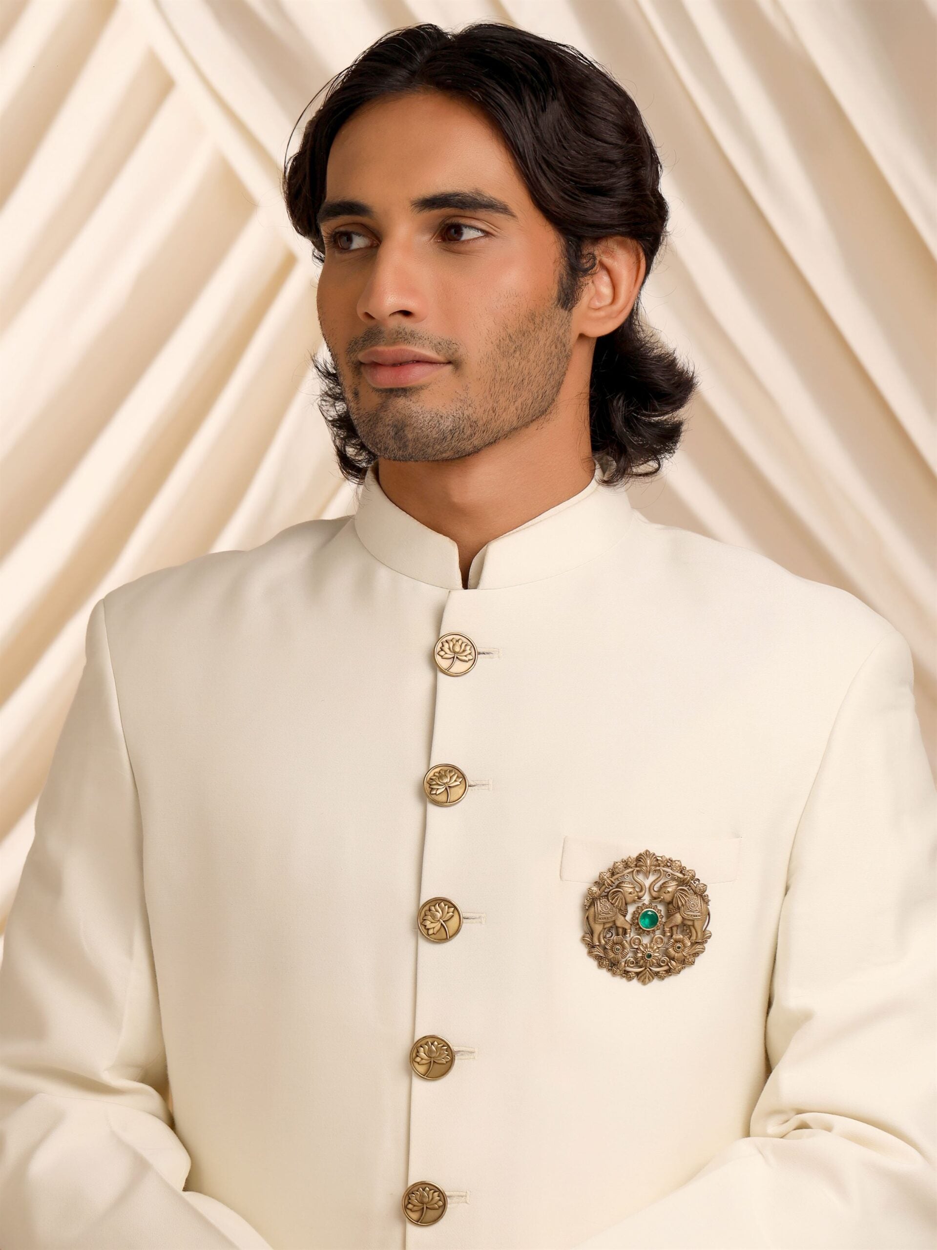 The design of this brooch is a masterful blend of elegance and tradition. Two majestic elephants, adorned with intricate patterns, stand facing each other, their trunks raised in celebration or greeting. At the center of the piece, a radiant green stone draws the eye, symbolizing growth and abundance, while being encircled by detailed floral patterns. Each element of the design, from the embellished elephants to the delicate floral motifs, has been intricately crafted to evoke a sense of harmony and balance, making it a perfect representation of both nature and heritage. The use of metallic tones alongside the deep green stones adds depth and richness to the overall composition