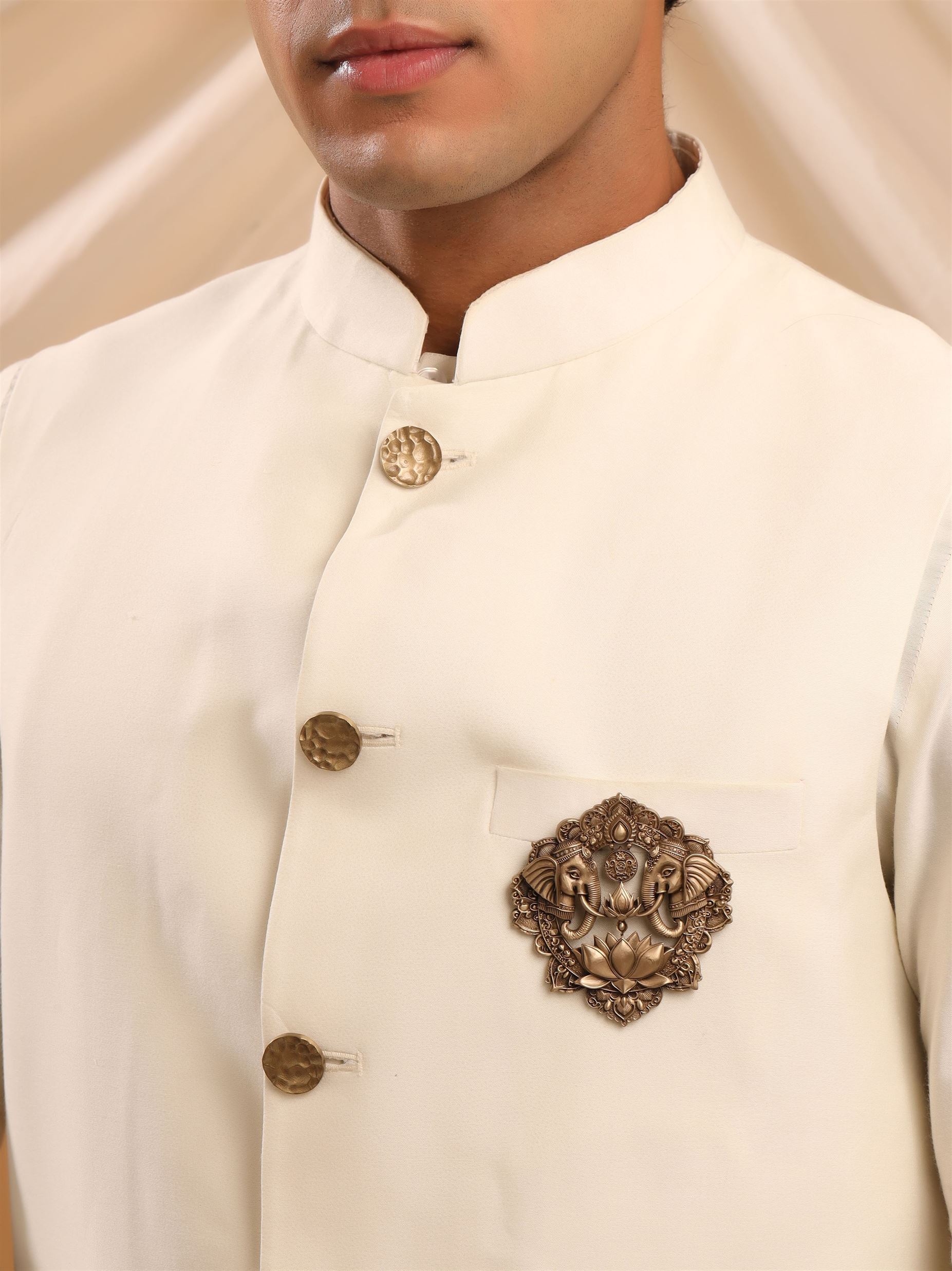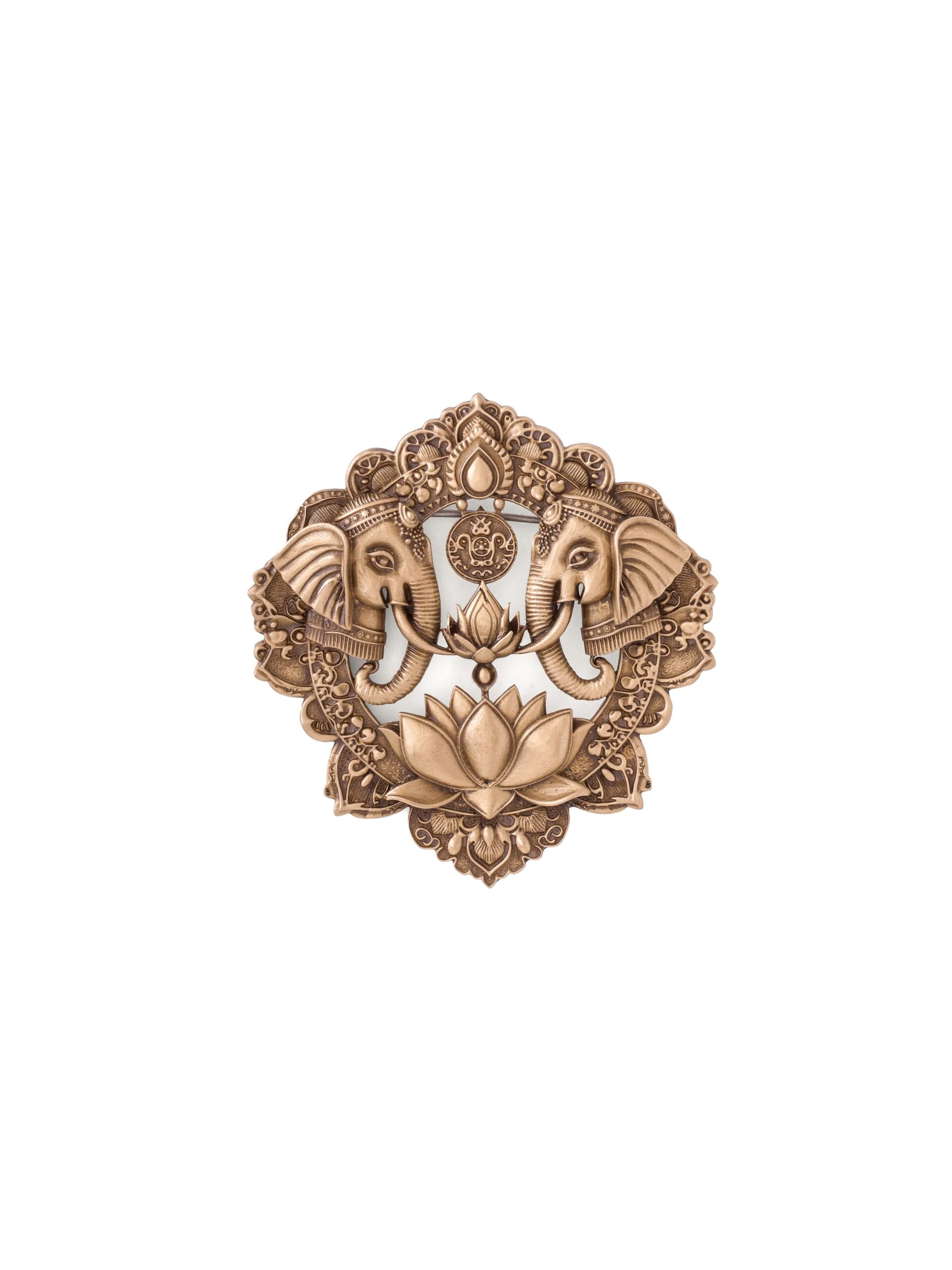 Our brooch is a masterpiece of design, featuring a duo of elephants in mid-stride, their trunks joyfully entwined. The backdrop is a flora tapestry, with a full bloom lotus cradling the scene. The antique gold finish adds a touch of vintage charm, making it a timeless accessory.