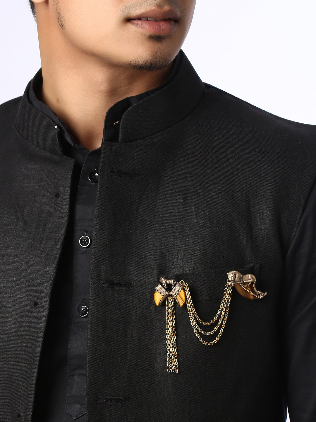 This handcrafted Emperor lion brooch with dangling chains in antique gold tone is made up of brass and genuine tiger eye stone. It is durable, lightweight and elegantly designed. Wear this precious adornment on a bandhgala or any jacket. This brooch sure is a wedding essential.